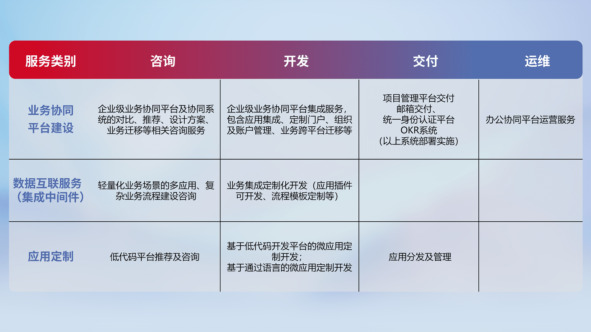 针对钉钉、、、、企微、、IDaas等平台级产品提供产品的规划、、、方案、、、交付、、定制化开发等服务,,,,实现如统一协同办公、、、智能客户服务、、、混合会议管理、、智能数据查询、、、等业务场景,,,实现数字化转型。。。。