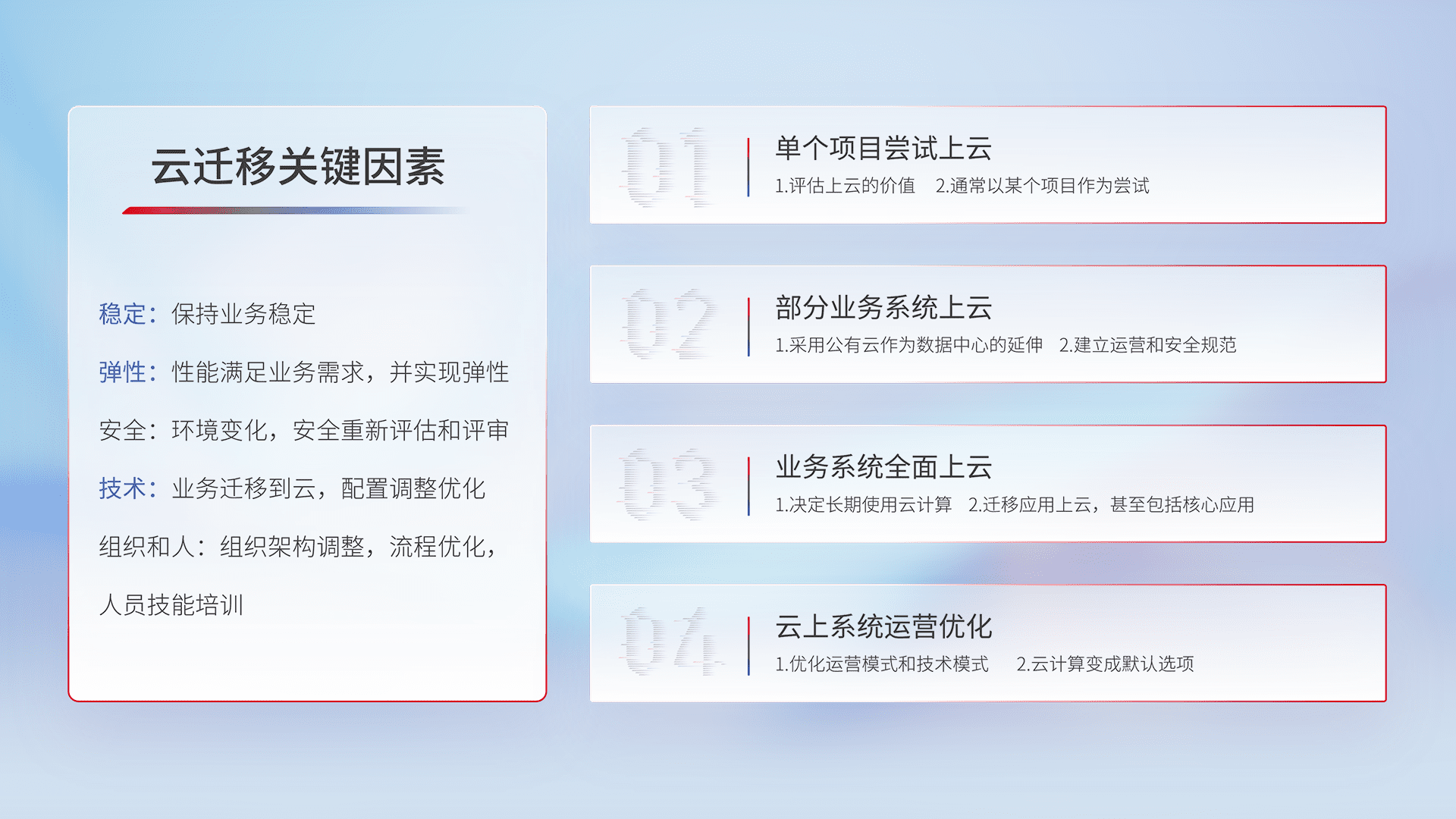 结合实际业务,,,,从规划设计、、云平台选型、、云原生改造、、、数据迁移、、、集成交付,,,迁移全过程为客户识别最佳上云路径,,,,做好风险识别管理,,设计网络架构、、、、身份权限、、、、安全审计合规、、操作审计、、日志审计、、、监控告警策略、、、多站点容灾设计等,,,,对云上基础设施进行整体规划,,提升IT治理水平,,以满足弹性、、高可用、、高性能的需求。。。