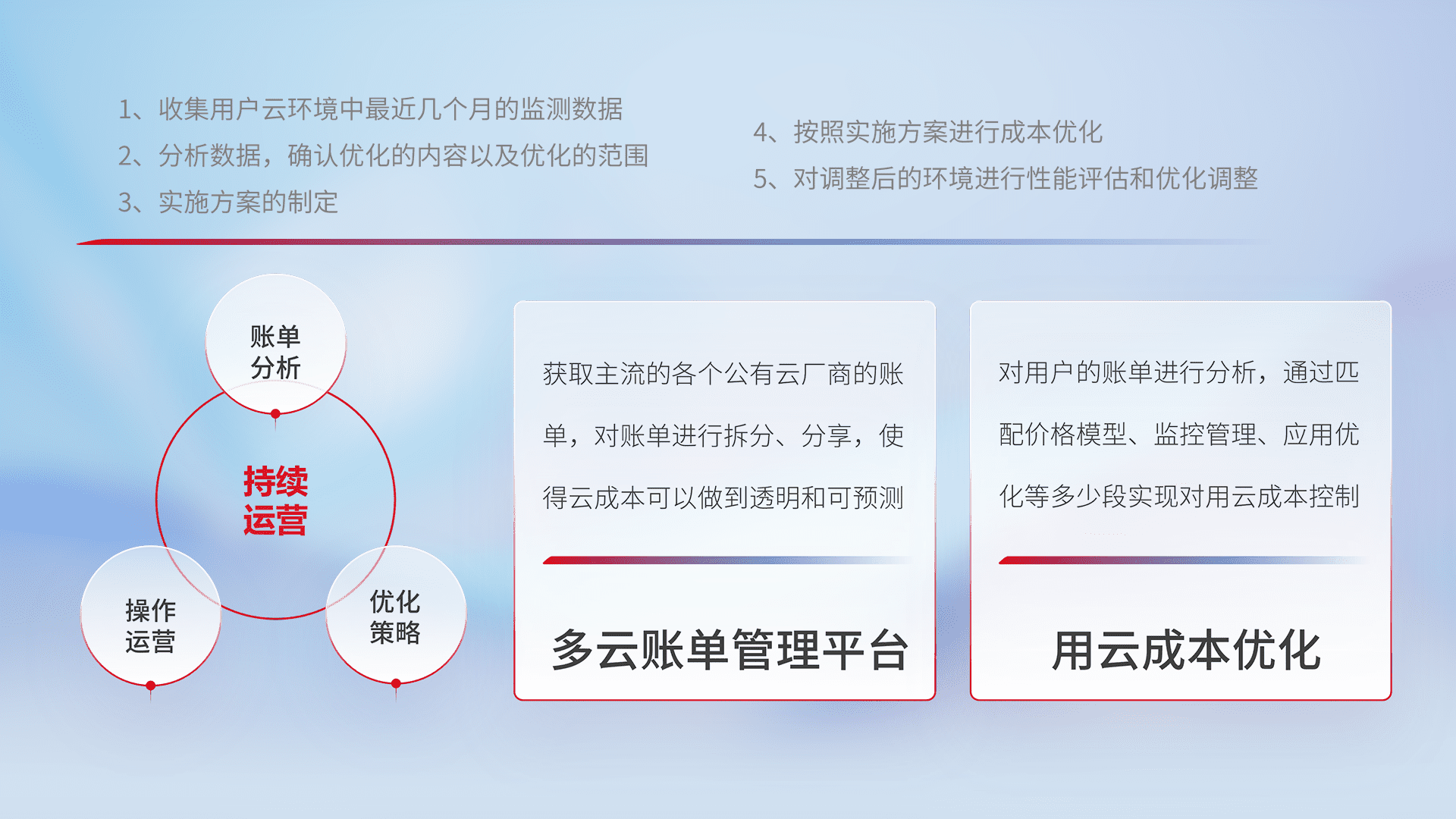 通过多云纳管,,,,以统一的资源数据模型把客户的云资源进行抽象和封装,,进而实现对多云资源的统一操作,,,,保障云资源管理的可靠性、、、、稳定性与可用性。。。量身定制化运维内容,,,,配置、、、开发运维、、补丁管理、、备份、、、、监控、、认证和访问管理、、、审计和日常巡检等,,,,保障在用云过程中的可靠度,,,稳定度以及高可用率。。。。